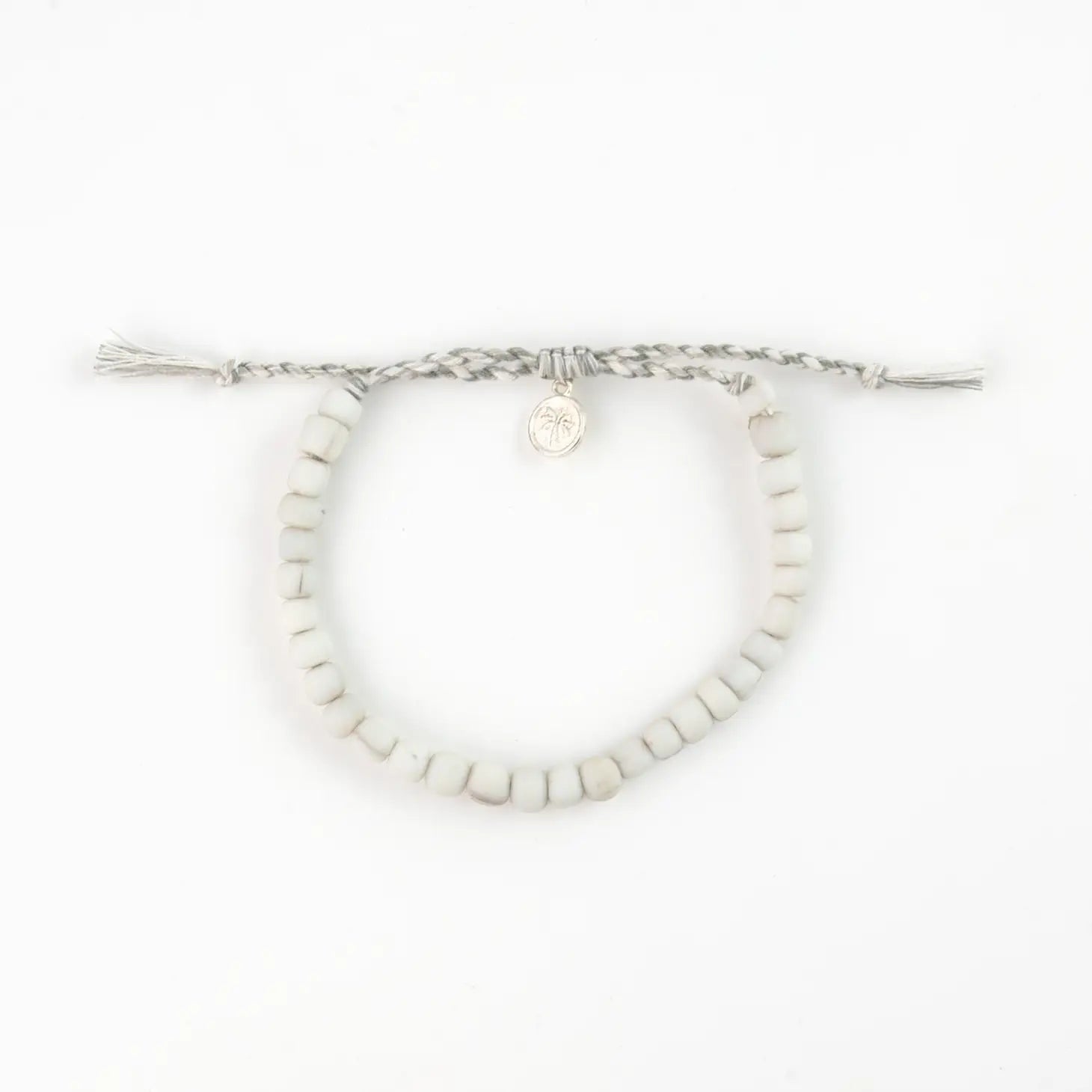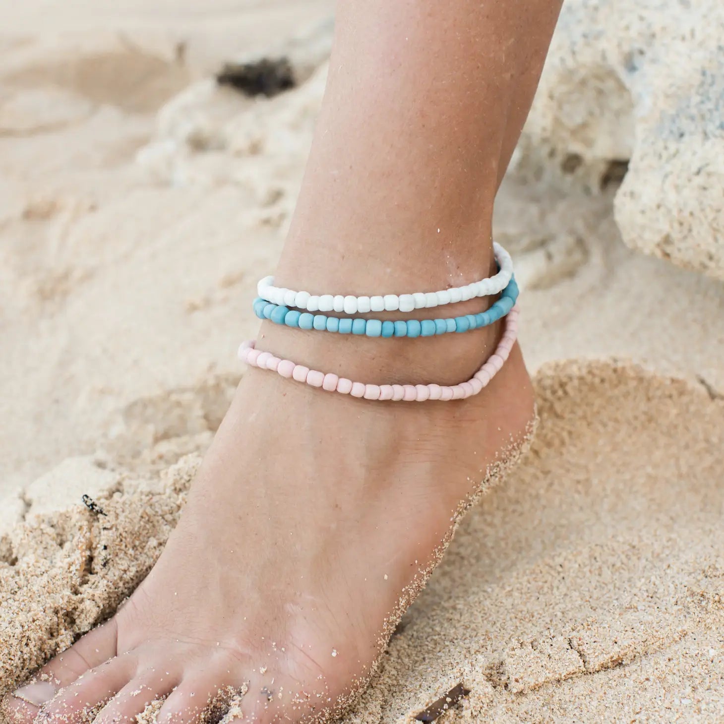 Accessorise your ankles this year with the Labuan Bead Anklet! This piece features colored beads with a matte finish, threaded along a multi-toned braided cord. Handmade in Bali. Biodegradable packaging. Available in white, pink or blue tones.
