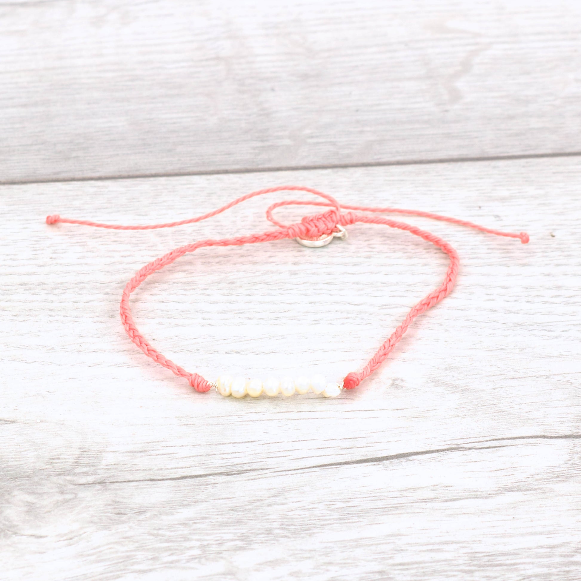 Handmade bracelet from Bali. Waxed ribbon with freshwater pearls.