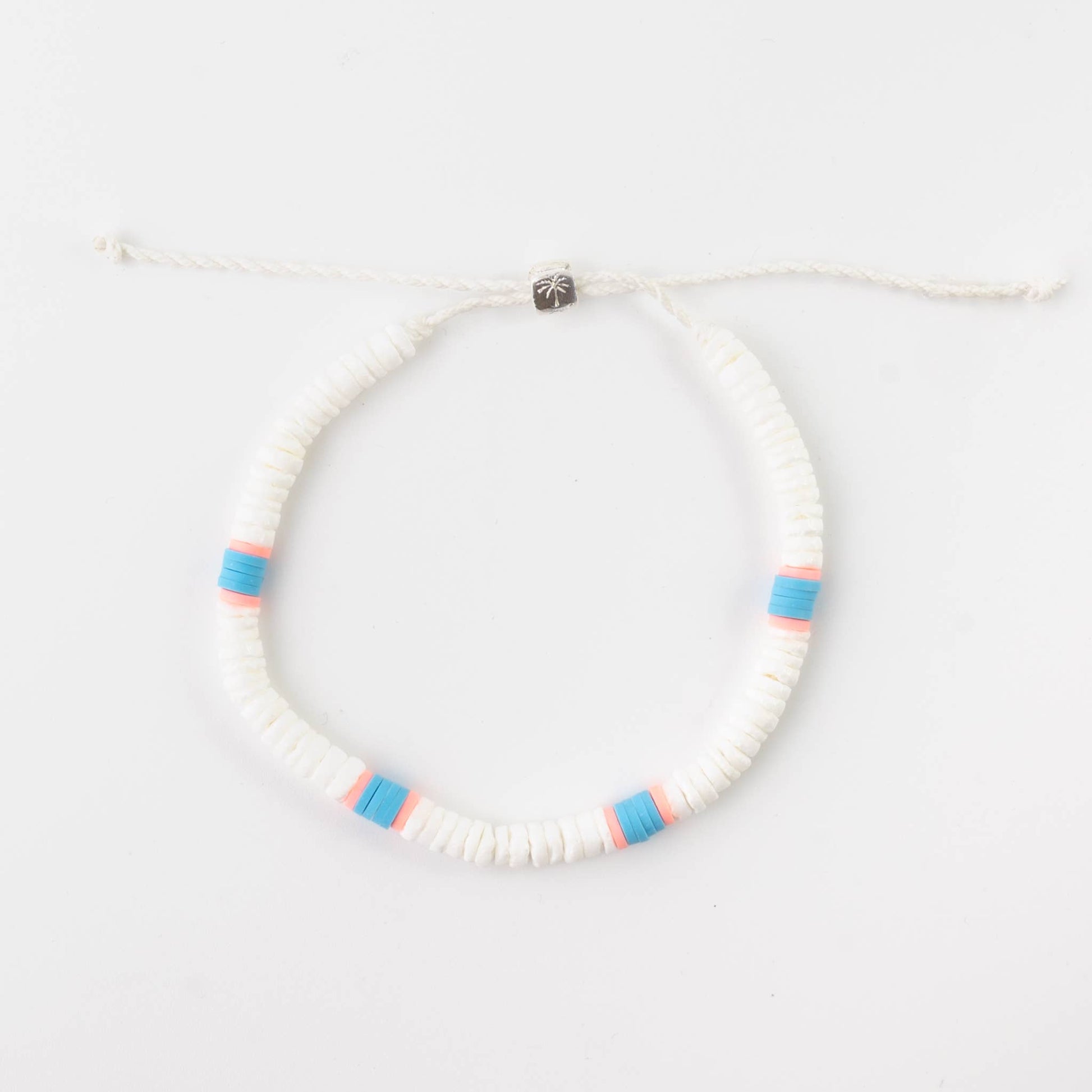 Famous for its pink sand and bright turquoise water, Tangsi Beach is the inspiration behind our Tangsi Puka Shell Anklet. Patterned with brightly colored clay disc beads, this anklet is woven together with a tough wax polyester cord to survive those long beach day adventures. - Made with clay disc beads, puka shell and wax polyester cord. - Measuring 19cm in length with a 9cm sliding knot extension. - Handmade in Bali. - Biodegradable packaging.