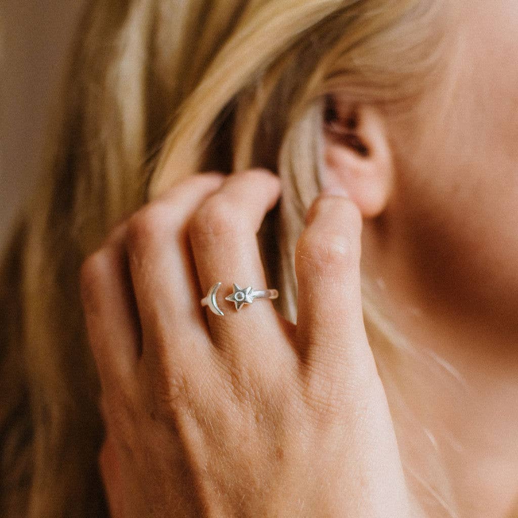 Worn solo or stacked up, our handmade adjustable moon and star ring brings a touch of celestial to your everyday style. This open and adjustable ring design allows you to create a range of looks and styles on different fingers. Perfect worn on its own or stacked up with your other favourite rings. Created using freedom trade practices and ethically produced in Bali, this moon and star ring is the perfect gift for the eco-conscious. Zinc alloy with silver coating. 100% nickel-free. Diameter approx. 2cm.