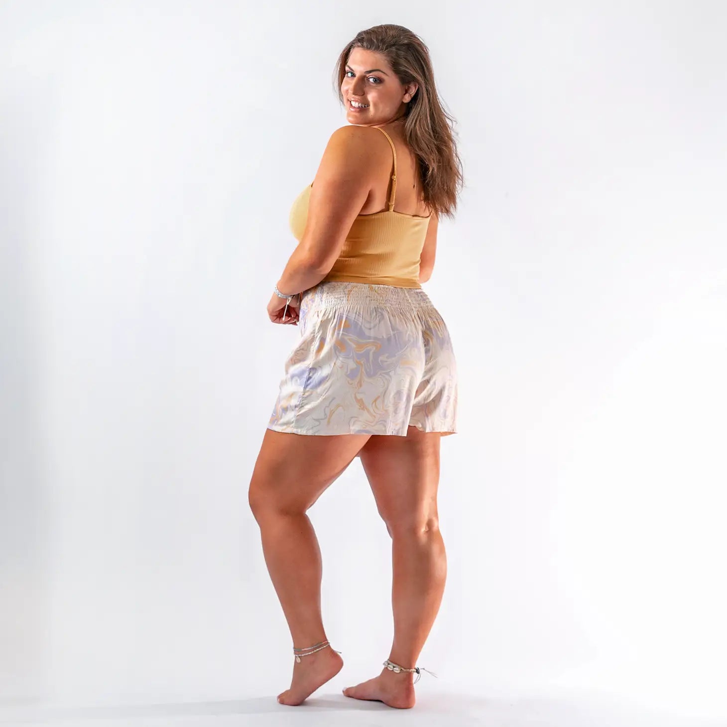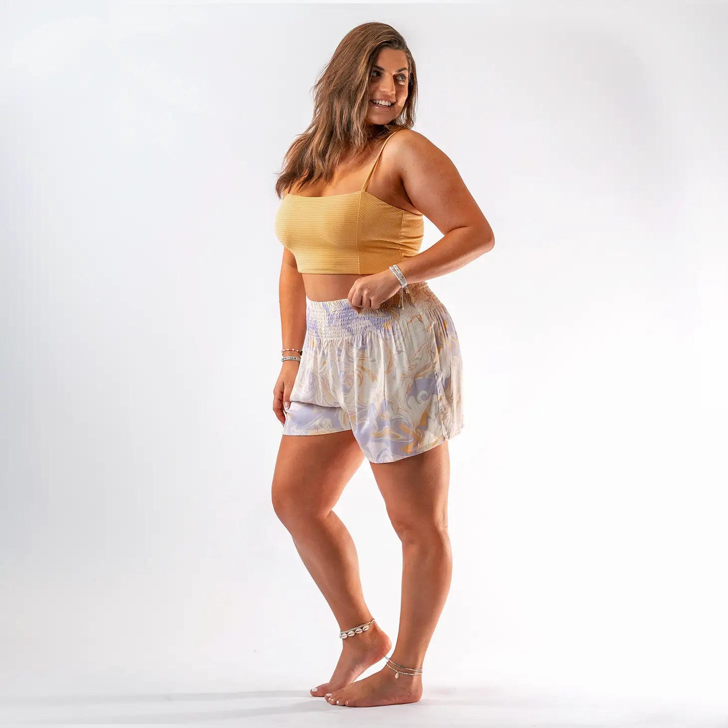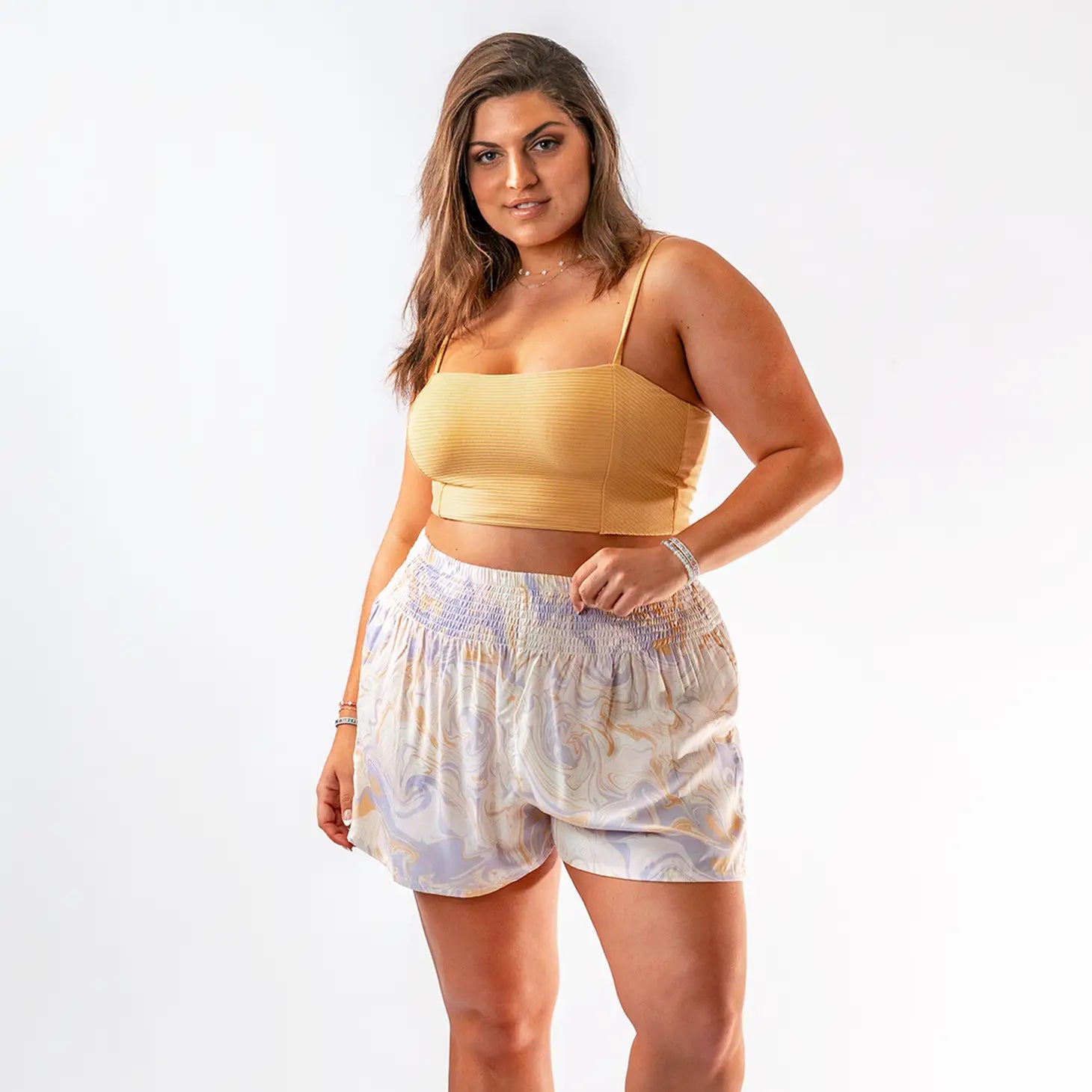 Inspired by our top selling lounge pants, Lotus and Luna's new beach lounge shorts are sure to be a favorite among your customers this season! Complete with a comfortable elastic waistband and gorgeous new patterns, they're perfect for the beach or any casual outing. Color: Lavender Marble Print Sizing details: S/M - Recommended for sizes: 0-12 L/XL - Recommended for sizes: 8-18 Details & Care: Machine Wash on Delicate, hang dry, low iron