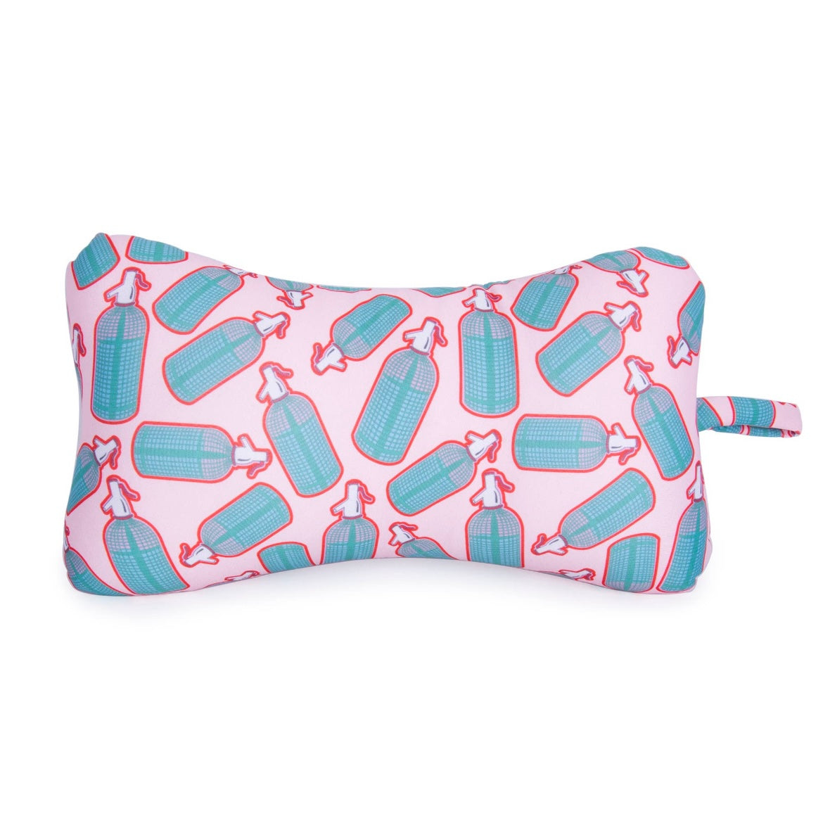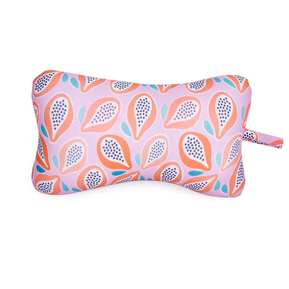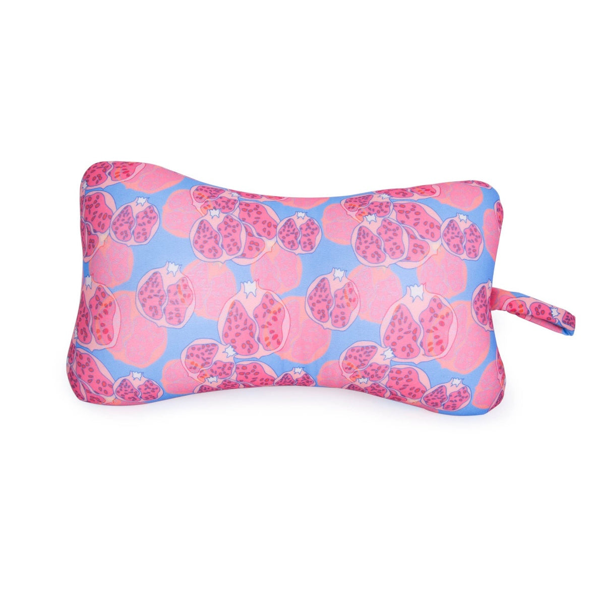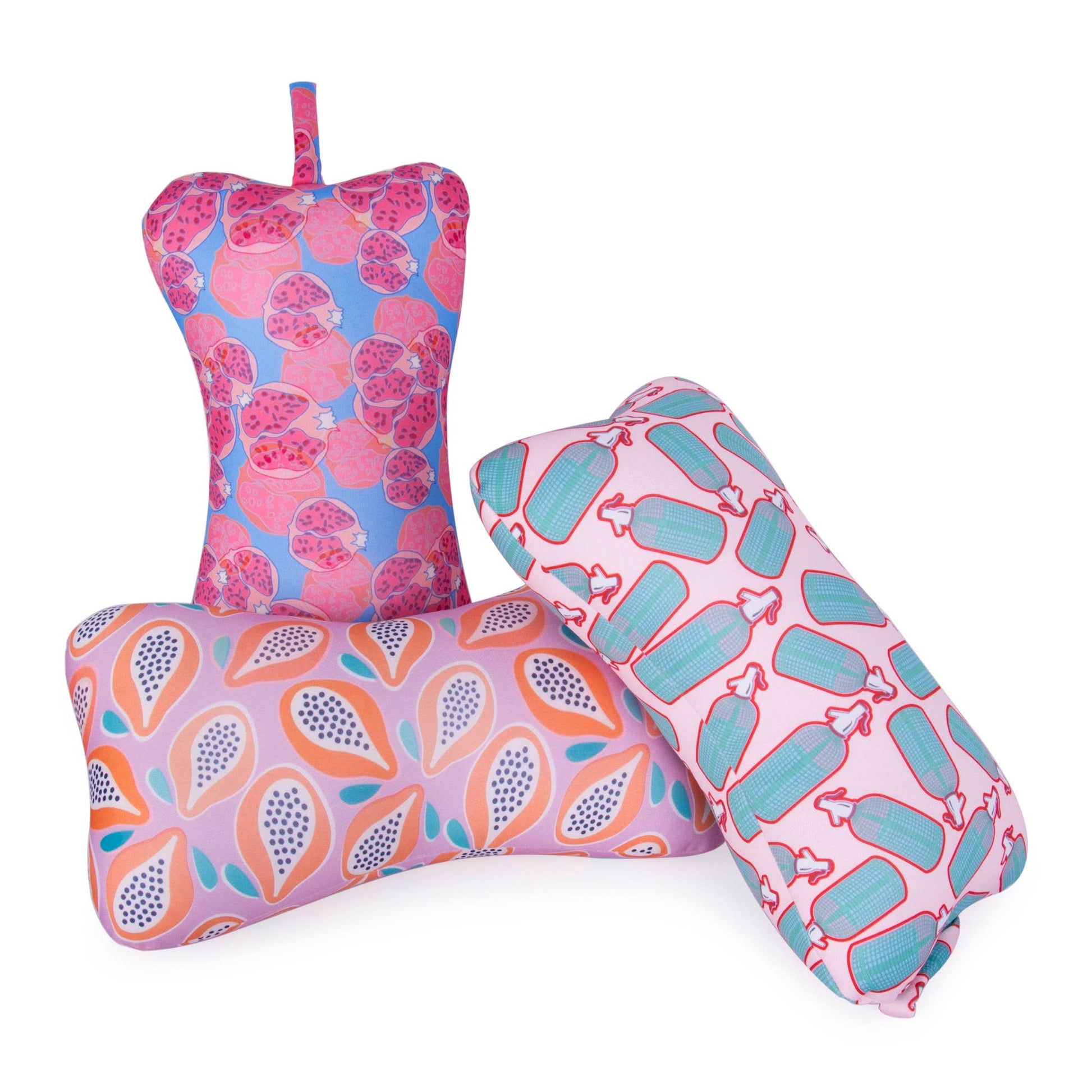 Soft beach cushions. They have a rectangular shape and are spongy and soft touch. Ideal to transport because of its small size. They have a tape to carry them more comfortably and hang them. Not removable. There are three models available: papaya, pomegranate and