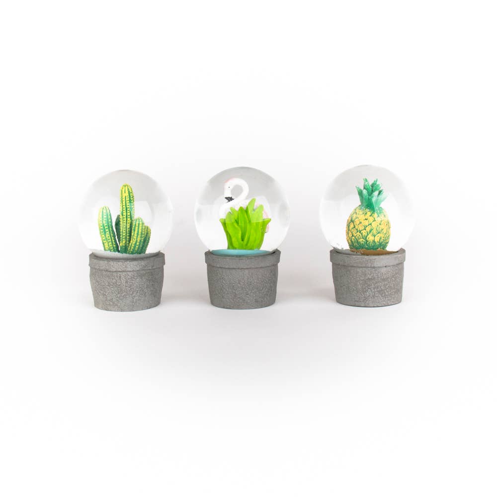 Tropisk snøkule med ananas, kaktus eller flamingo inni.