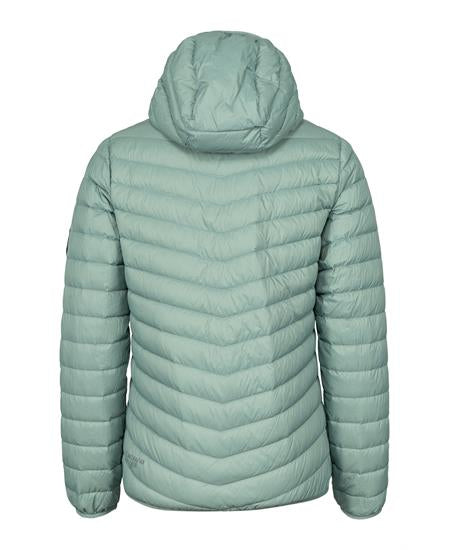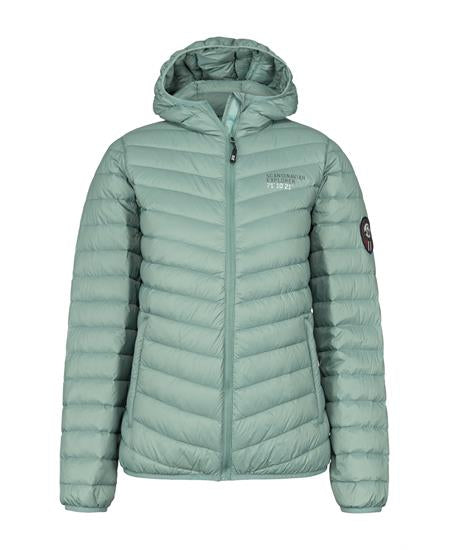 Behagelig, ultralett feminin dunjakke i grønn mint fra Scandinavian Explorer. Like fin på tur som på byen. Følger med en liten pose til å pakke jakken i, slik at den tar liten plass i bagasjen på tur. Norsk design inspirert av skandinavisk natur.