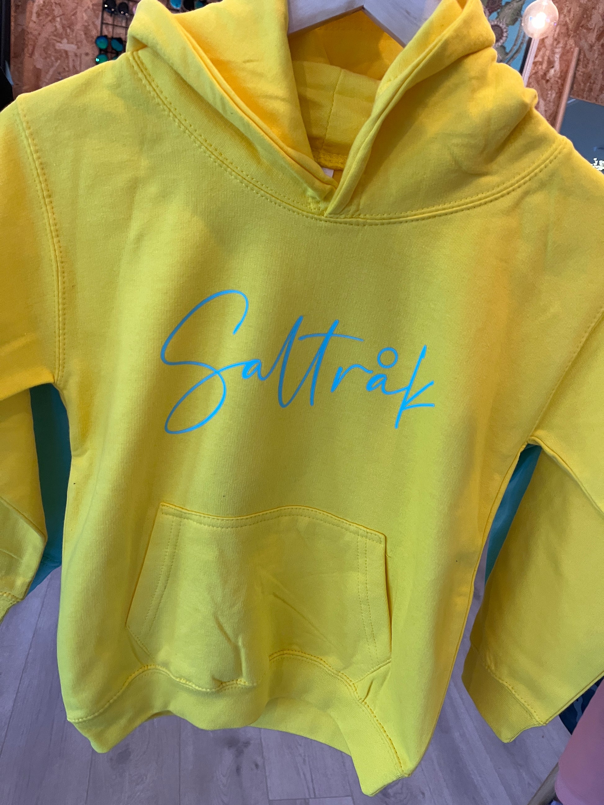 Gul hettegenser i collegestoff, med trykk på brystet samt lomme på magen.