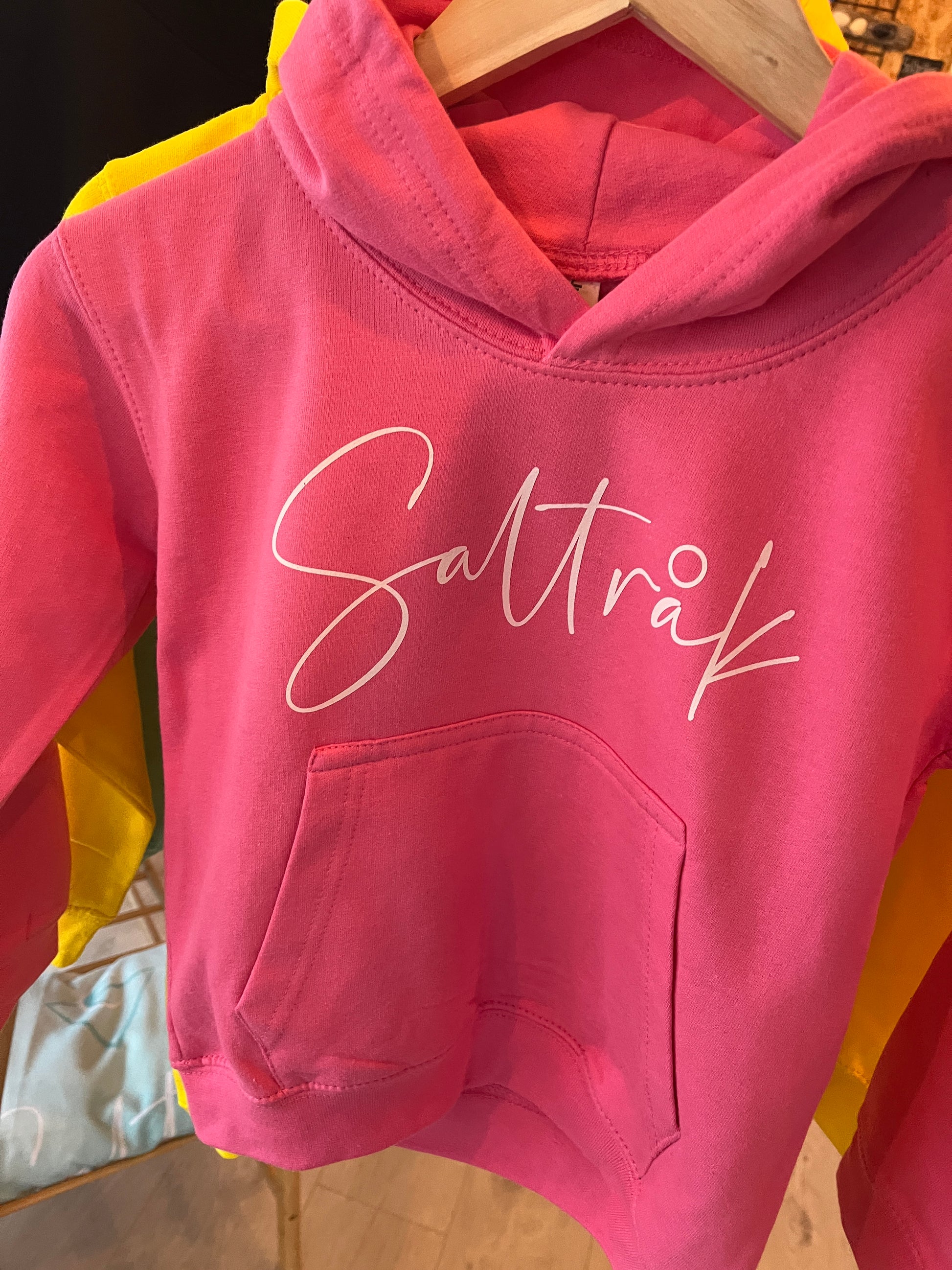 Rosa hettegenser i collegestoff, med trykk på brystet samt lomme på magen.