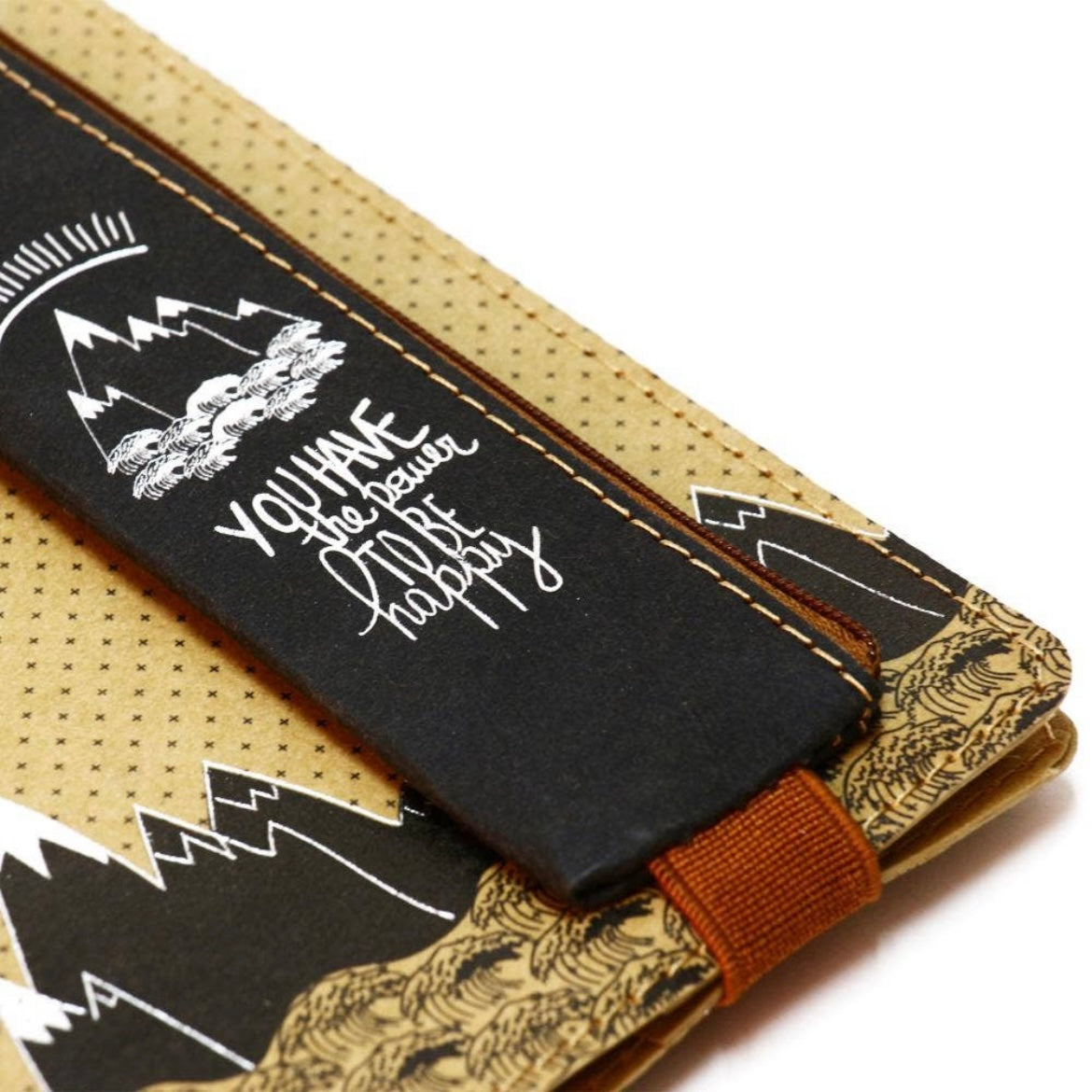 Kraft style notebook and pencilcase set. The notebook is A5 size with smooth white sheets. The sleeve can be reused when the pages are finished. It is complemented by a small pencilcase with zip fastening that is attached to the notebook thanks to its elastic strip.