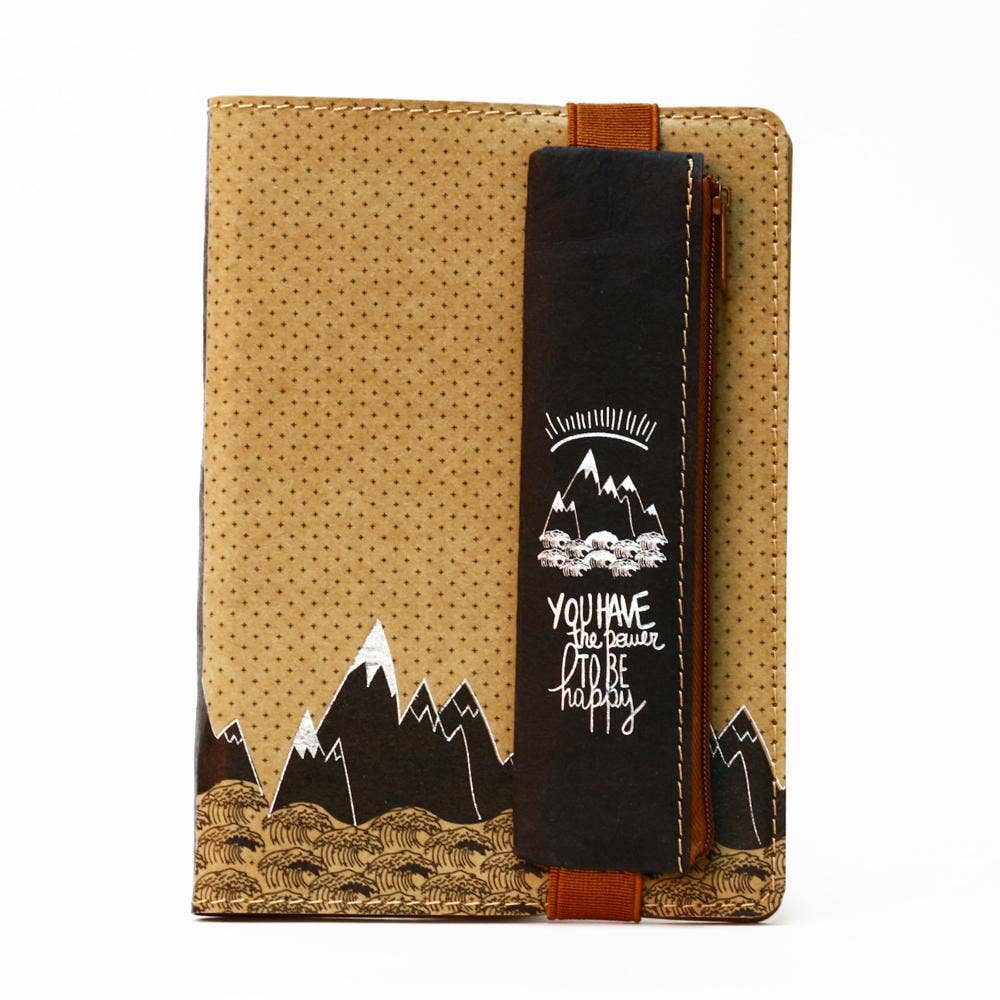 Notatblokk i str A5 med avtagbart omslag og penal festet på utsiden. Omslaget kan tas av og brukes om igjen på andre bøker.