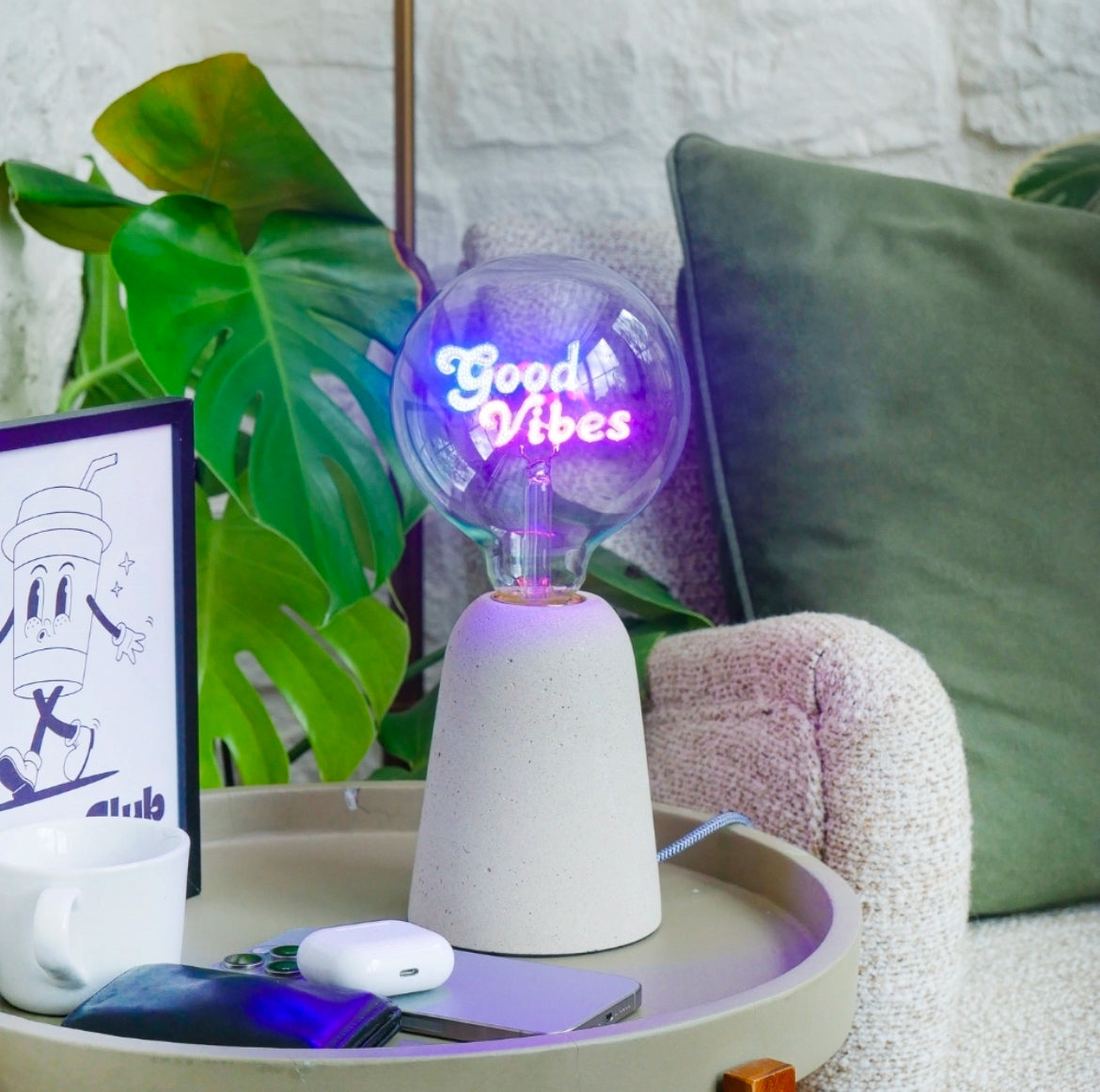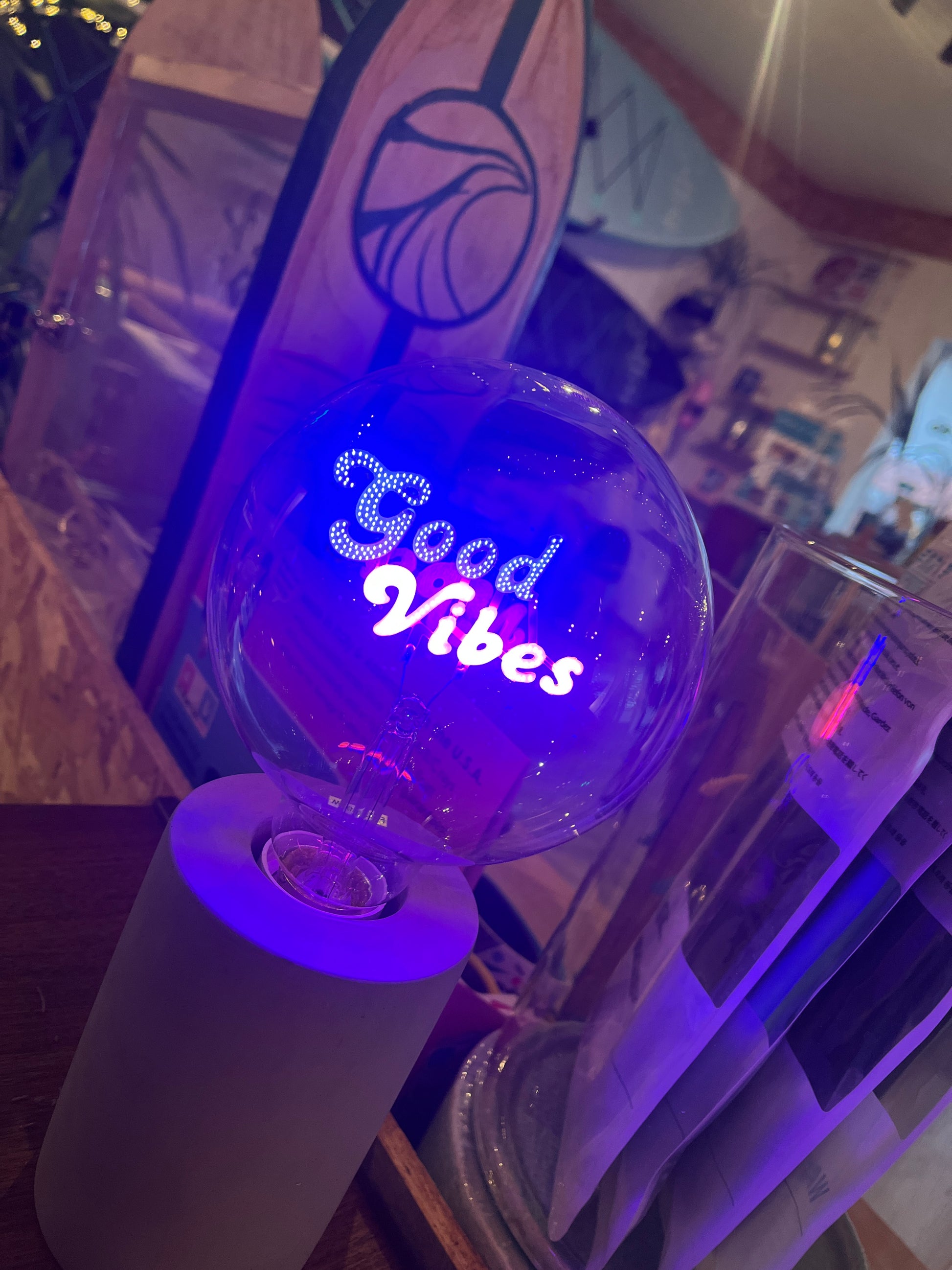 LED-lyspære med teksten «Good Vibes». Lampefot medfølger ikke. Kan brukes i alle lamper med standard E27 sokkel.