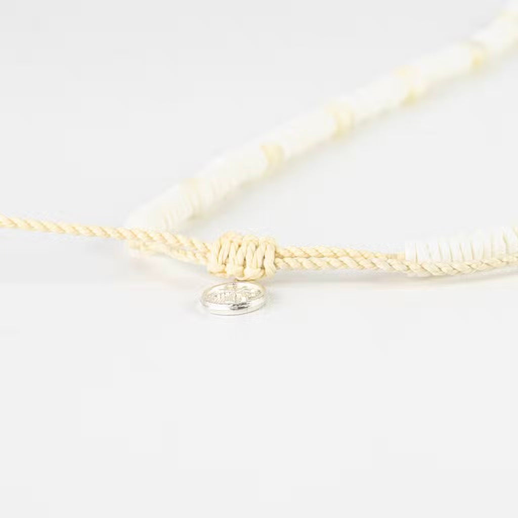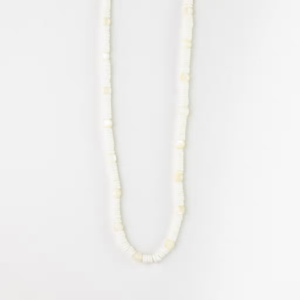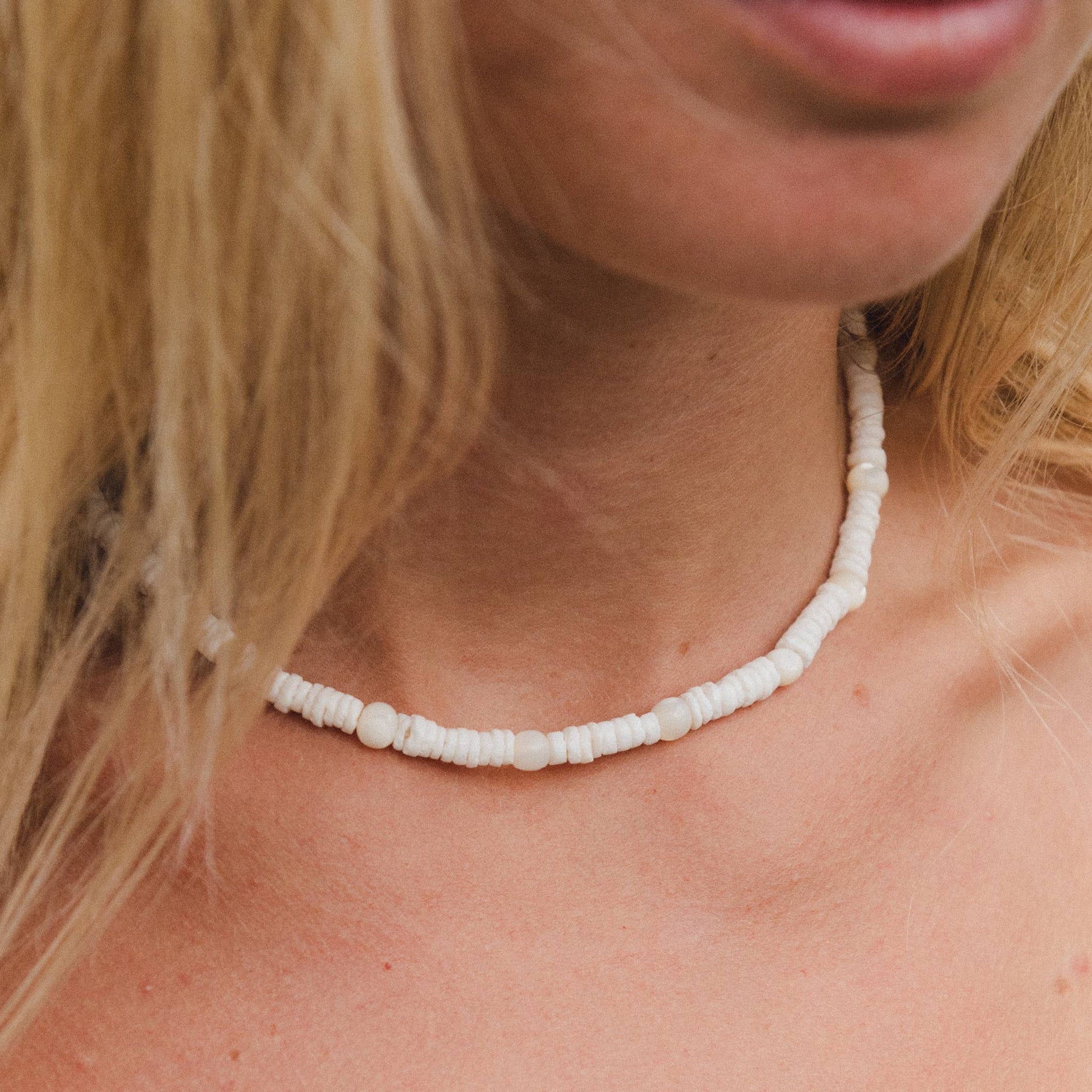 Madasari Beach Mother of Pearl Bracelet - an adjustable choker necklace with mother of pearl & puka shell beads for the perfect surf aesthetic. An ethically produced puka shell necklace design, ideal for stacking with your other favourite Pineapple Island necklaces. OBX inspired!