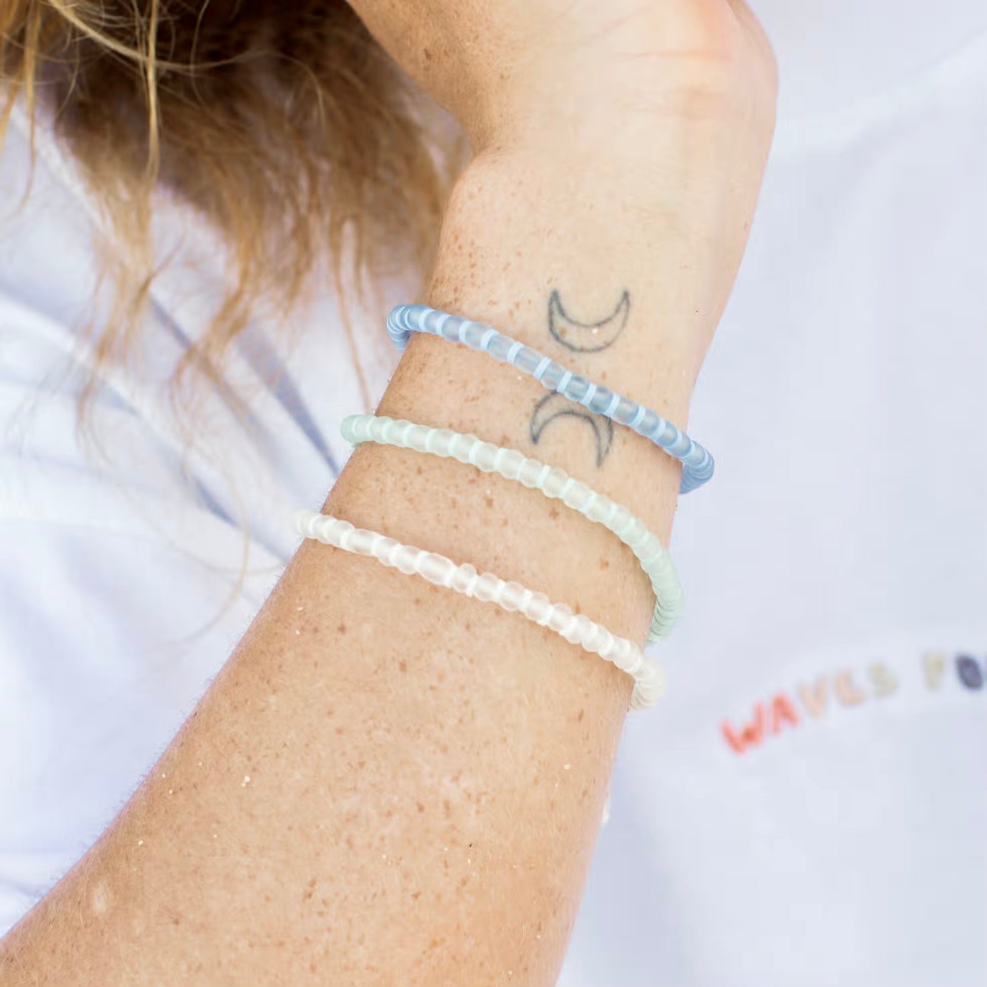 Level up your surf style with a Marley Glass Bead Bracelet. This bracelet design is available in pastel blue, green or white, and features frosted glass beads and tiny clay discs.