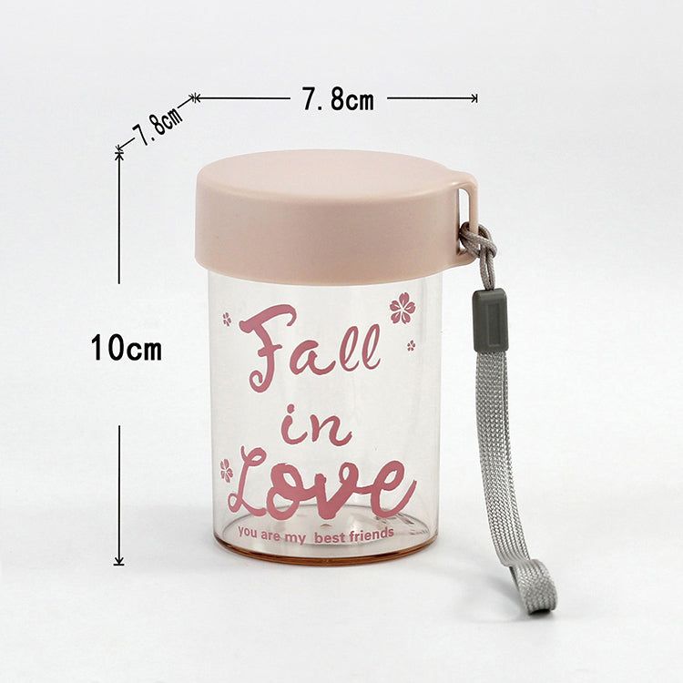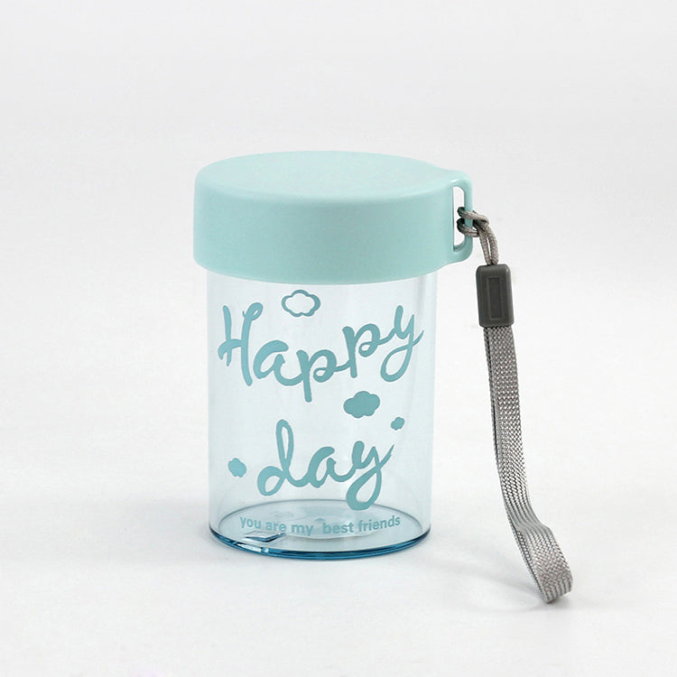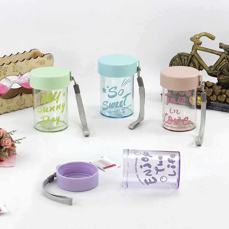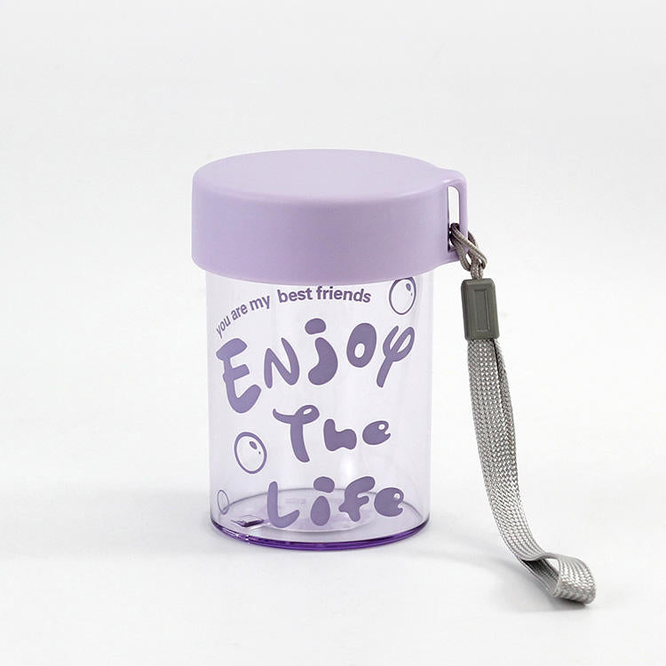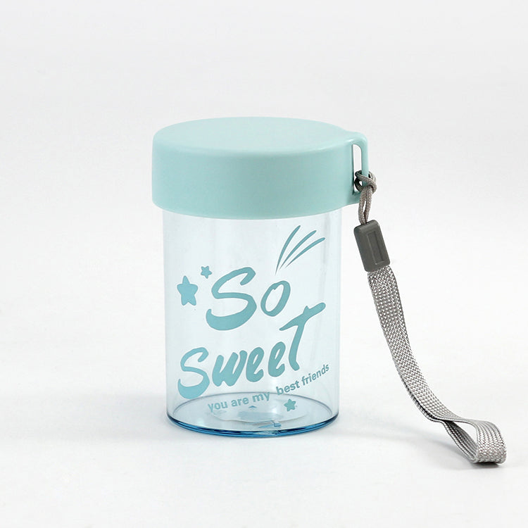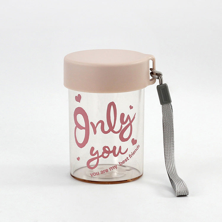 Small multipurpose plastic bottle. It has capacity for 250ml, the bottle is transparent with a painted phrase in matching color. The cap is colored with threaded clousure and a ribbon to be able to hang. Colors: Green, Pink, Turquoise/blue or Purple. It is ideal for carrying liquids, nuts, candies etc…