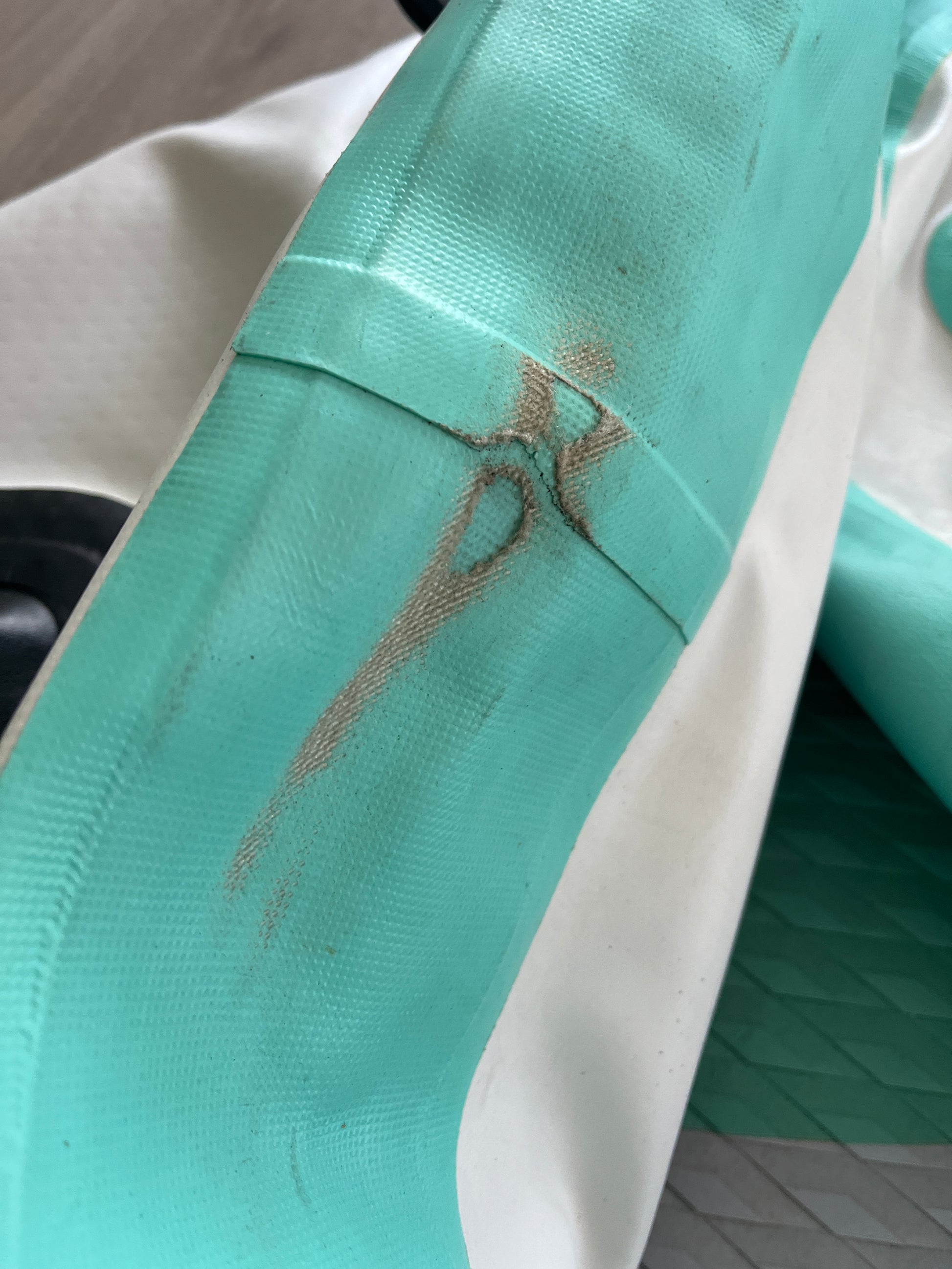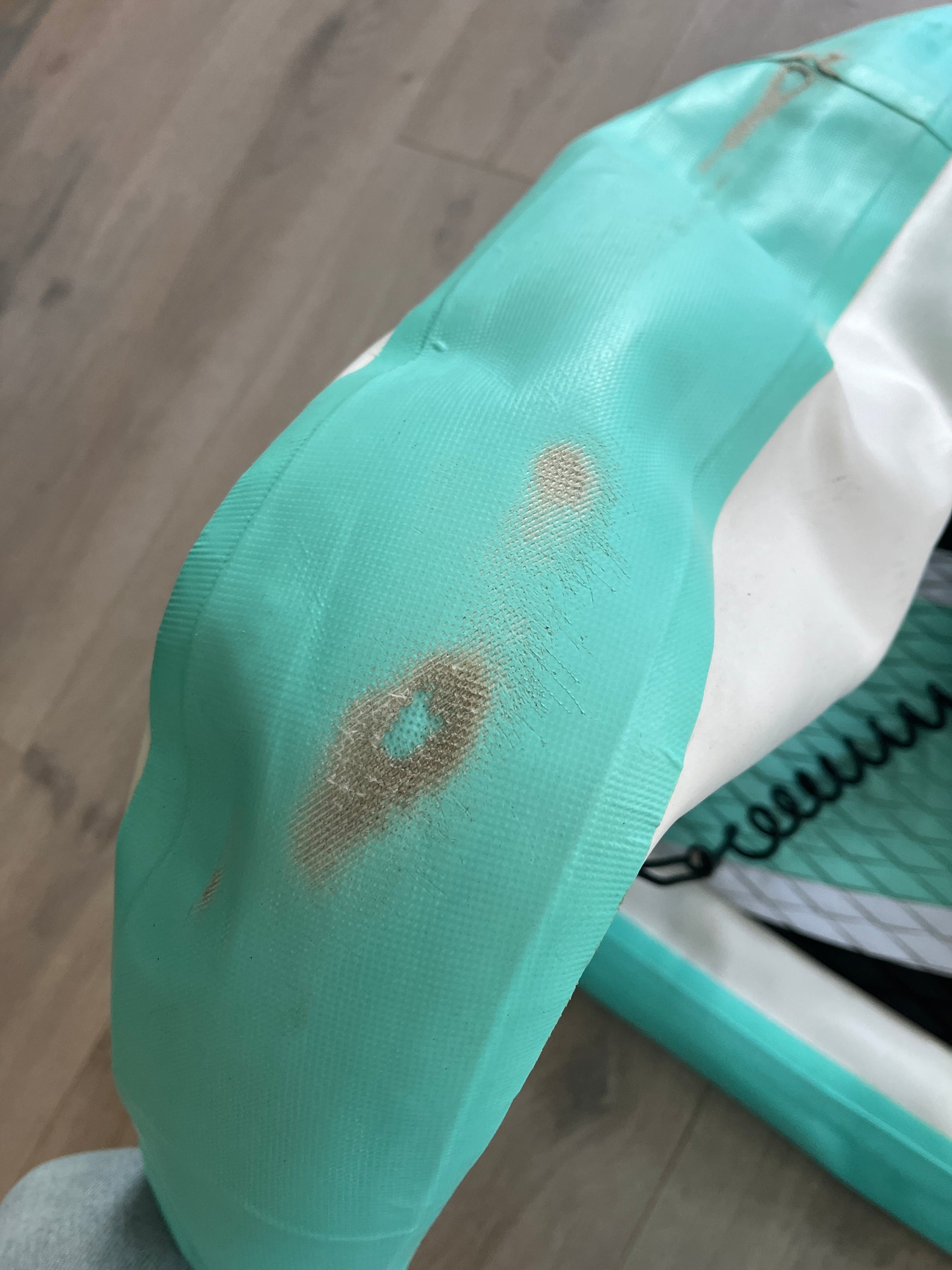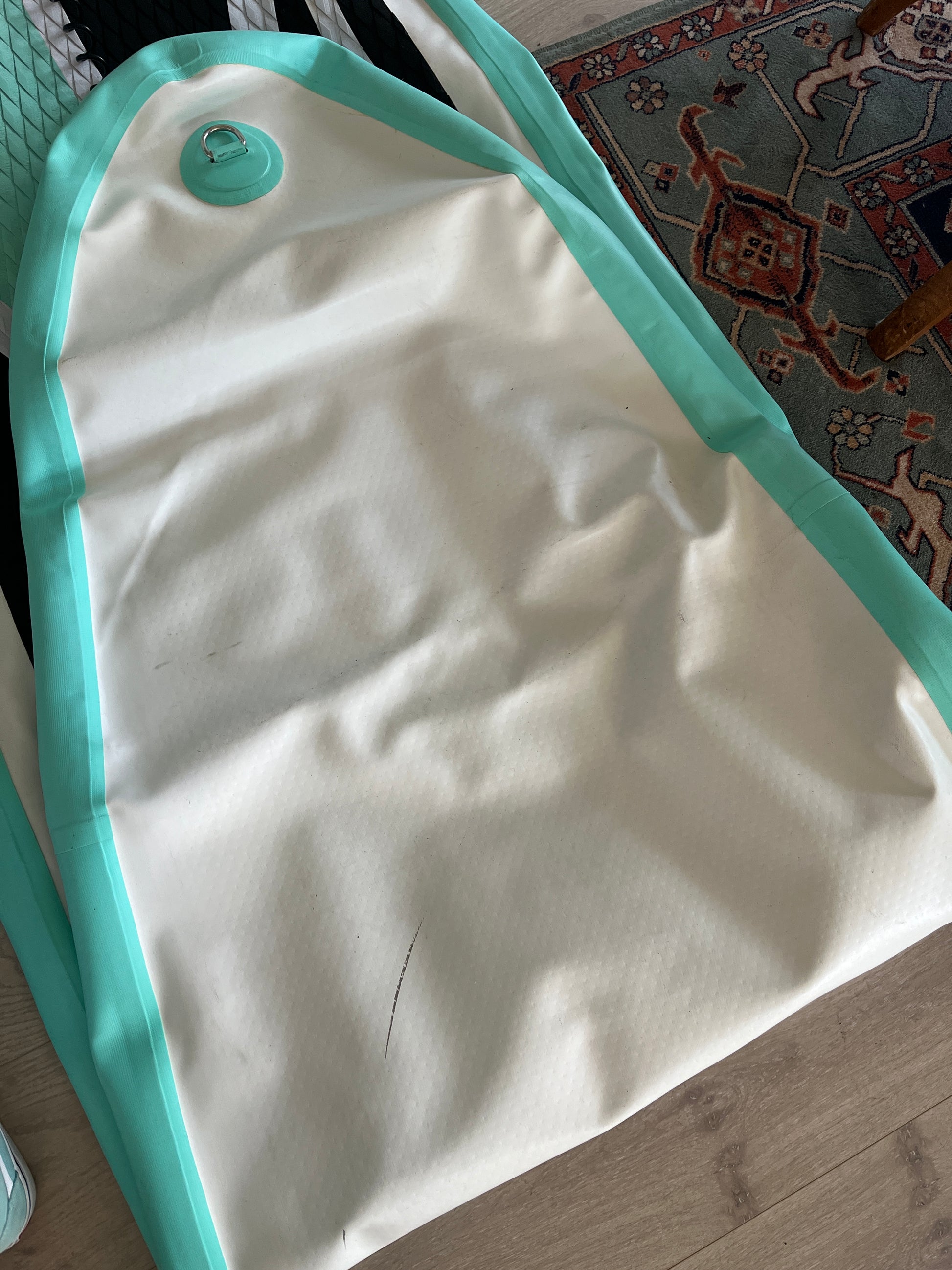 Brettet er brukt i en 2-ukers periode på sommerskole. Det er en "slepeskade" langs kanten fremme på høyre side, men det er ikke hull gjennom selve brettet, kun i det ekstra laget PVC. Fullt brukende SUP med alt tilbehør inkludert.