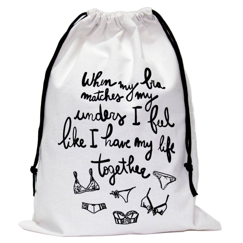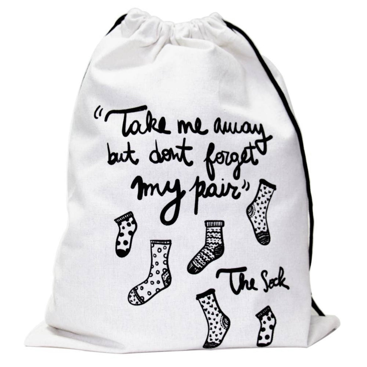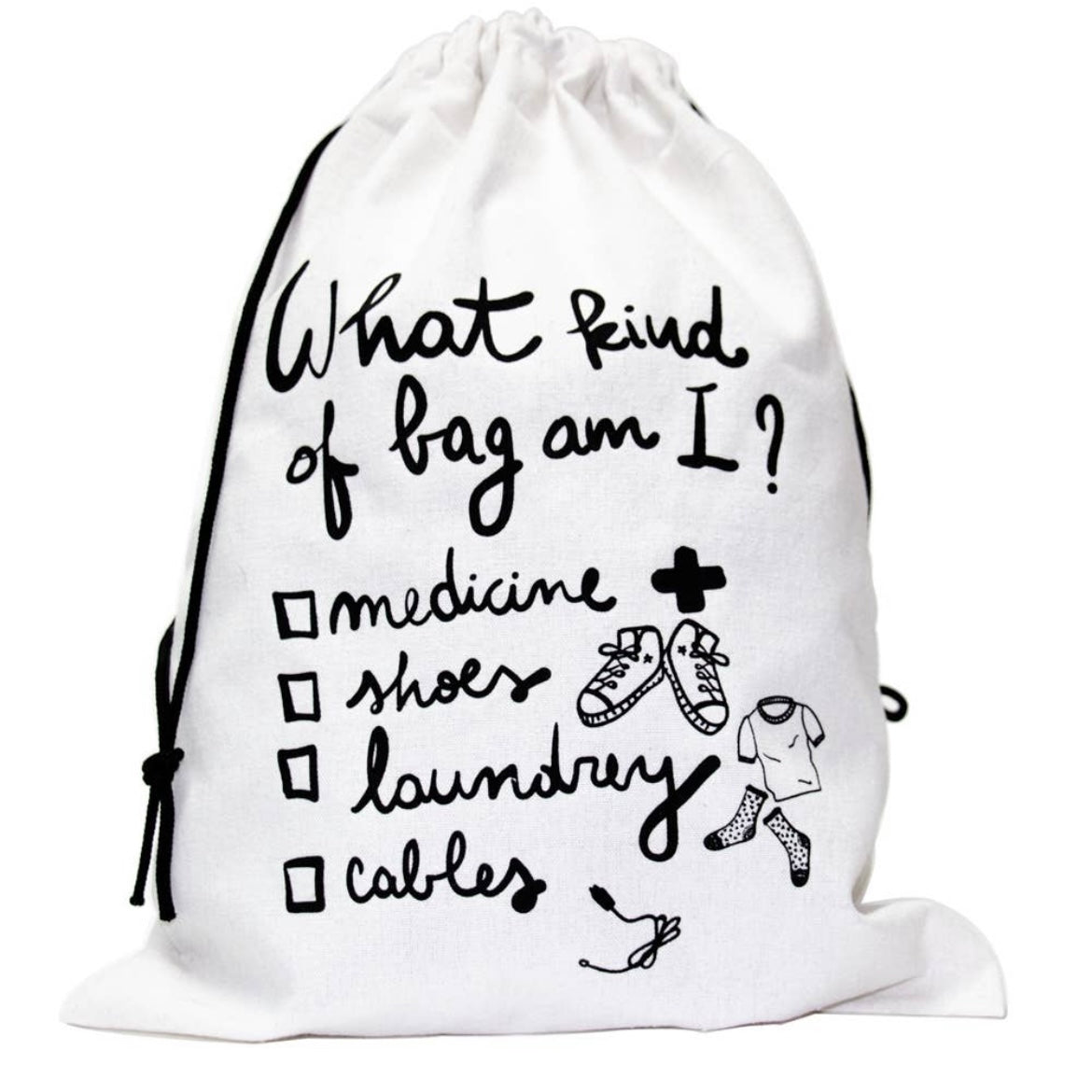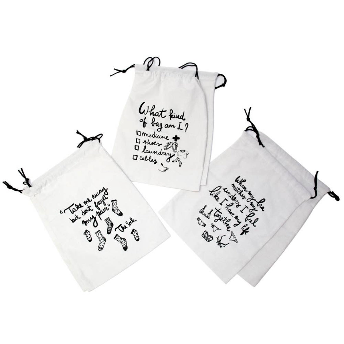 Cotton bags to organize luggage. They close by knotting them with the upper strips. Color: Raw white with printing of witty phrases in black. Models: Underwear, Socks and Multipurpose. Ideal to organize your luggage without losing space.