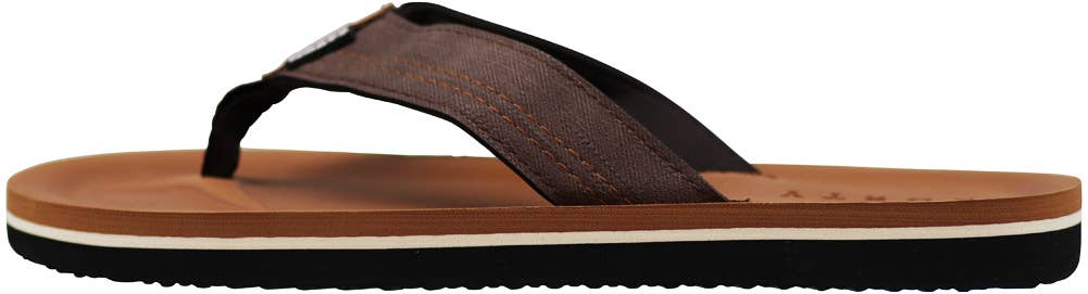 Norty mens comfortable thong flip flop, wear indoor or outdoors all day and be comfortable in a soft yet firm sandal, woven fabric or faux leather outer strap with a soft fabric lining on the under side of the strap, fabric toe post for extra comfort , 3/4" platform, durable rubber sole with a non slip texture, man made materials.