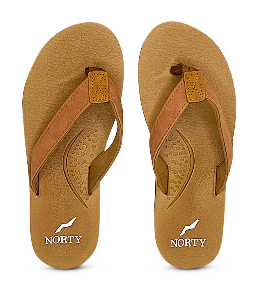 Norty women's thong flip flop sandal, flexible and comfortable, perfect flip flops for beach, pool or any other occasion, fabric toe divider, heel height is approximately 7/8 inches high, all man made materials.