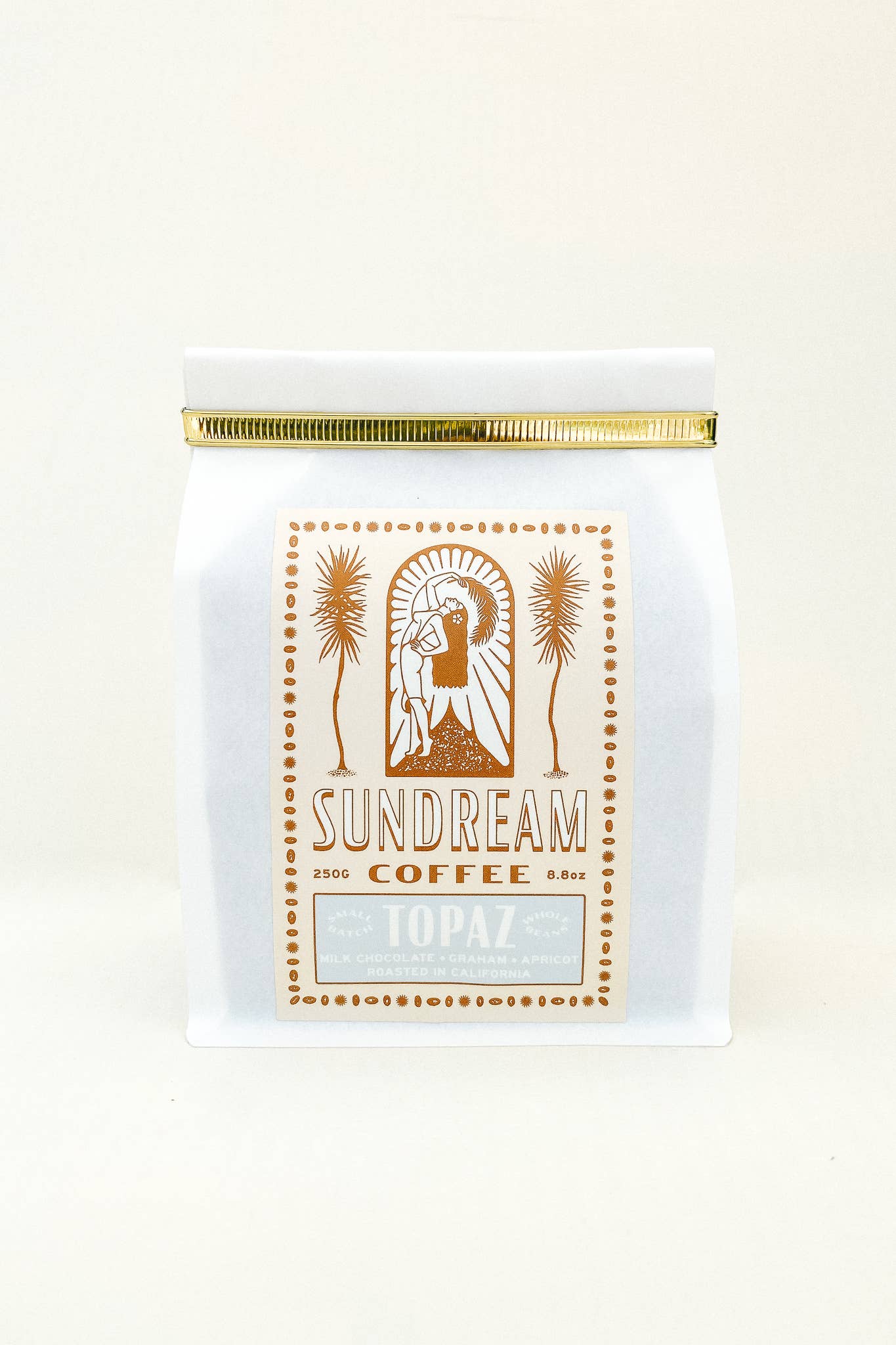 ABOUT THIS COFFEE: Inspired by our local surf break, the Topaz blend has the spirit of an epic beach day in mind. It's classically sweet and undeniably inviting with a creamy milk chocolate-like body with hints of graham and a bright stone fruit finish.
