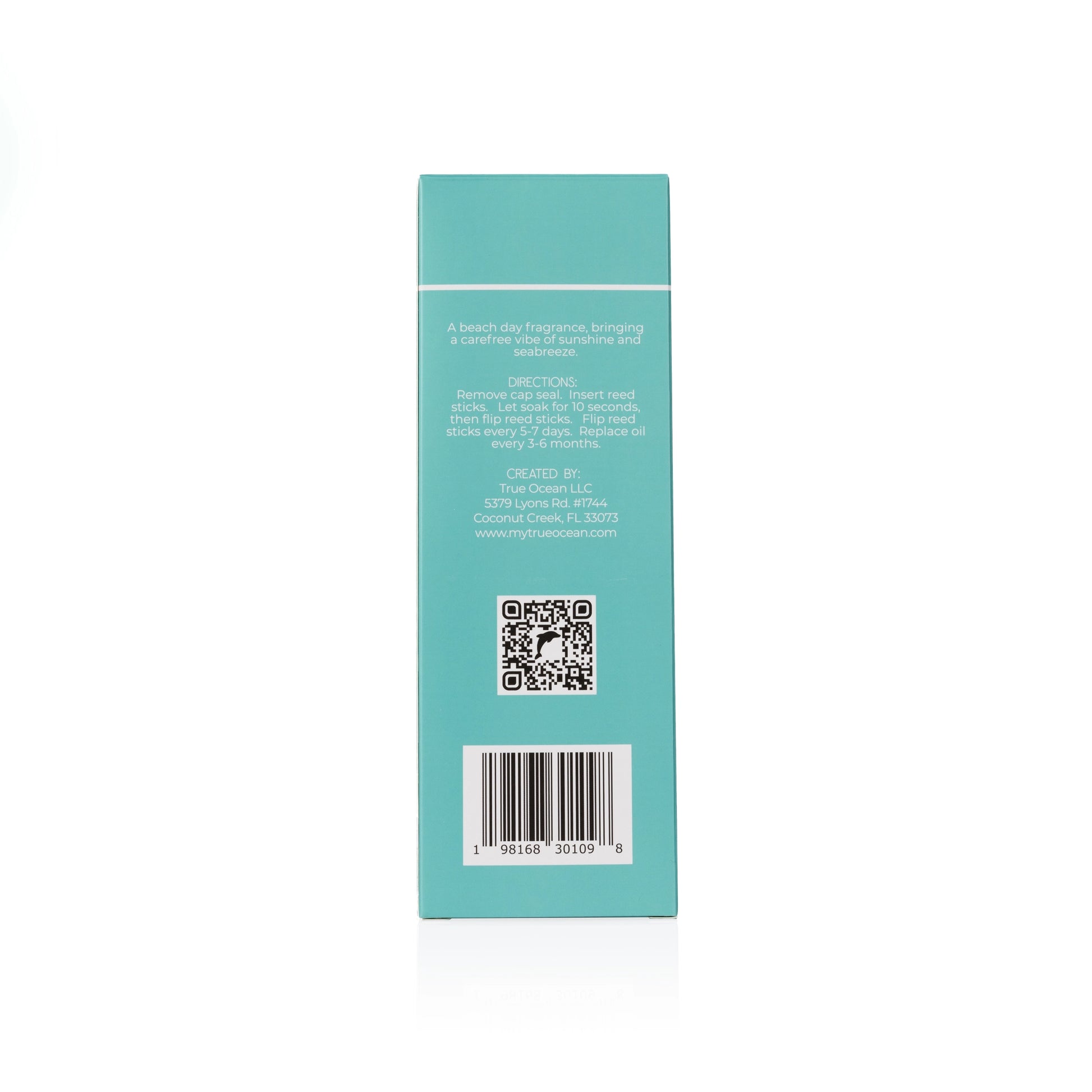 White ceramic and bamboo reed diffuser with True Ocean's signature Coastal scent. A beach day fragrance with notes of bergamot, palm leaf, and mandarin. Bringing a carefree vibe of sand, surf, and ocean waves.