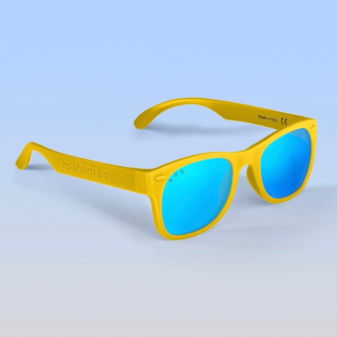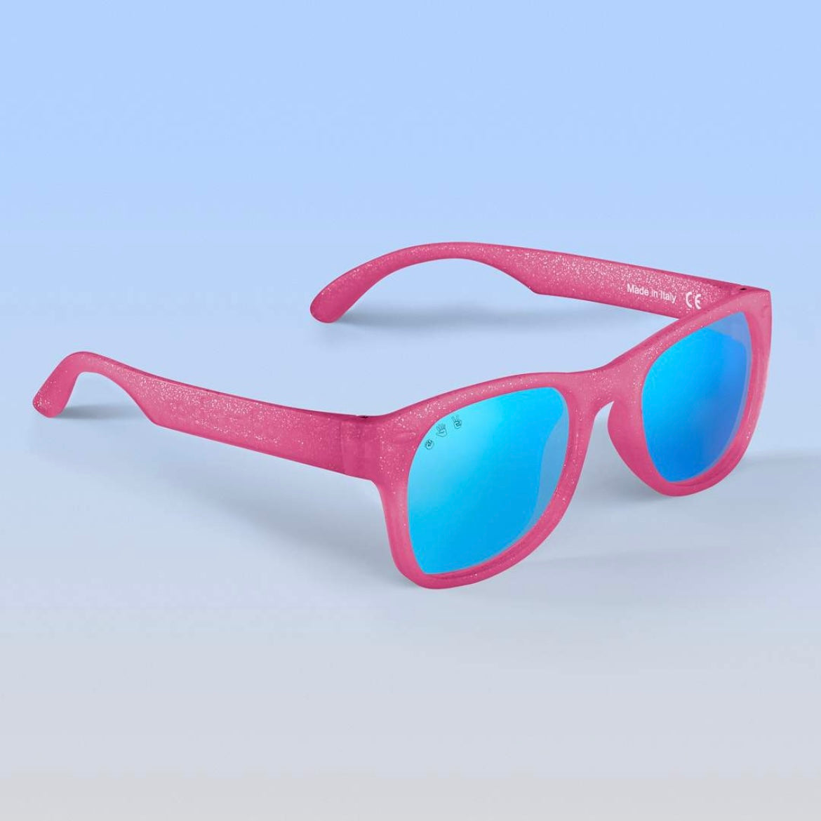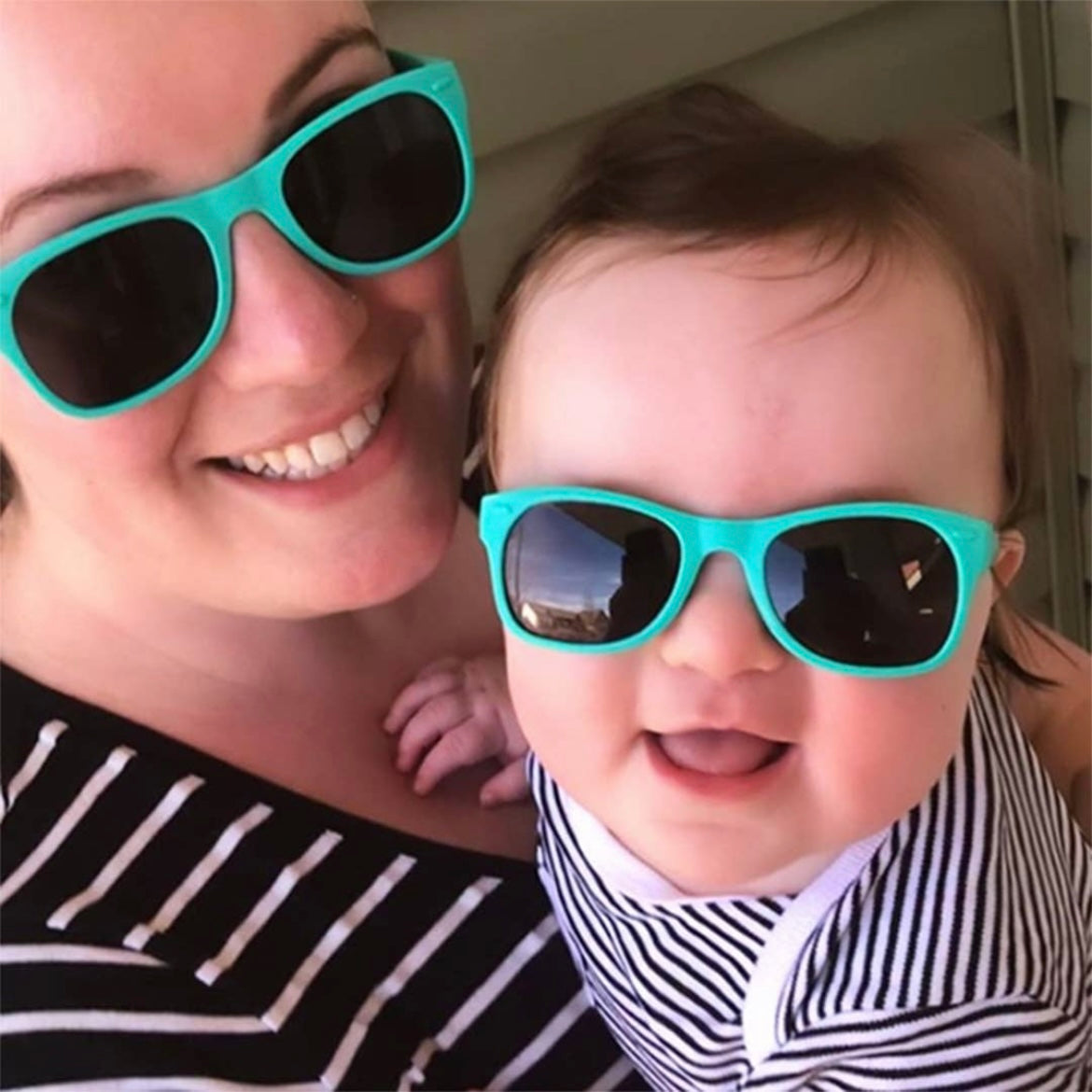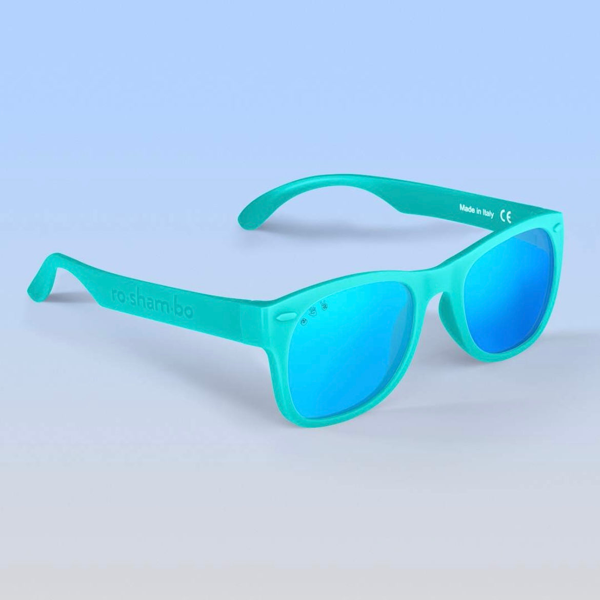 Our mint "Goonies" sunglasses with polarized lenses: + 100% UVA/B/C protection and shatter resistant, with added glare reduction to reduce eye strain and protect your eyes. + Made in Italy like your designer shades, and assembled in USA. + Nearly indestructible: we offer a full damage and lens replacement guarantee. + Certified BPA, lead, and latex free. Small parts tested as safe for babies.